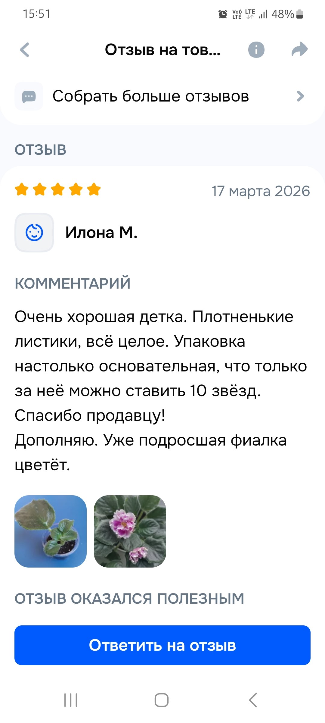 Отзыв на фиалку с нашего магазина на Озон